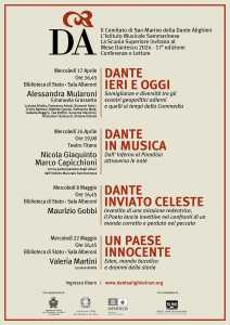Si continuerà mercoledì 8 maggio nella Sala Alberoni della Biblioteca di Stato nell’ascoltare il professore Maurizio Gobbi, grande conoscitore e interprete della Divina Commedia e di tutta l’opera dantesca, che si cimenterà in un argomento specifico dal titolo “Dante inviato Celeste”.