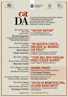 Anche nel 2026 la Repubblica di San Marino rinnova uno dei suoi appuntamenti culturali più significativi: il Mese Dantesco, rassegna promossa dall’Associazione Sammarinese Dante Alighieri. Giunto alla sua XIX edizione, il Mese Dantesco si conferma come un laboratorio culturale di alto profilo, capace di coniugare rigore scientifico e apertura interdisciplinare, coinvolgendo studiosi, docenti, artisti e studenti in un dialogo continuo tra tradizione e interpretazione. Realizzata in collaborazione con l’Istituto Musicale Sammarinese e la Scuola Superiore, e con il patrocinio della Segreteria di Stato per la Cultura, dell’Ambasciata d’Italia a San Marino e della Commissione Nazionale Sammarinese per l’UNESCO, l’edizione 2026 propone un percorso che si sviluppa tra aprile e maggio, arricchito da una significativa integrazione tra parola, musica e arti visive. Elemento distintivo di quest’anno è il riferimento all’ottavo centenario francescano, che attraversa il programma e offre una chiave di lettura particolarmente suggestiva del pensiero dantesco, in relazione alla figura e alla spiritualità di san Francesco. Il ciclo di incontri prenderà avvio mercoledì 22 aprile alle ore 17.30 presso il Teatro Titano con An die Natur, un percorso tra musica e sensibilità francescana guidato da Nicola Giaquinto, con la partecipazione di docenti e allievi dell’Istituto Musicale Sammarinese e della Scuola Superiore. Seguiranno, presso la Sala Batoni del Museo di Stato, gli appuntamenti del 6 maggio, con Meris Monti e Paolo Valentini (Di questa costa… nacque al mondo un sole), dedicato alla figura di san Francesco tra Dante e la tradizione artistica, e del 13 maggio, con Maurizio Gobbi (Così nel mio parlar vogl’esser aspro), dedicato ai poeti “volgari” dell’età dantesca. Protagonista assoluto di questa edizione sarà Giuseppe Fanfani, artista e studioso di Dante, figura di rara completezza nel panorama culturale contemporaneo. La sua presenza costituisce il vero baricentro della manifestazione: da un lato autore della mostra Anime Prave, dall’altro relatore dell’incontro conclusivo del ciclo. La mostra, allestita presso il Museo di Stato dal 21 maggio al 7 luglio, presenterà un ciclo di opere pittoriche dedicate all’Inferno dantesco, nate da un approfondito lavoro di esegesi del testo. Le immagini di Fanfani non sono semplici interpretazioni artistiche, ma vere e proprie traduzioni visive della parola dantesca, capaci di restituirne la forza drammatica, la tensione morale e la densità simbolica. La presentazione inaugurale, prevista per mercoledì 20 maggio alle ore 17.30 presso la Sala Batoni, sarà affidata a suor Maria Gloria Riva, che offrirà una lettura teologica e iconografica dell’opera, contribuendo a mettere in luce la profondità spirituale del progetto. A suggello del percorso, mercoledì 27 maggio, lo stesso Giuseppe Fanfani interverrà come relatore con la conferenza Io fui di Montefeltro, io son Bonconte, dedicata al tema del pentimento e del perdono nel V canto del Purgatorio: un’occasione preziosa per cogliere, nella sua duplice veste di artista e interprete, l’unità tra pensiero, parola e immagine. Il Mese Dantesco 2026 si conferma così non solo come una rassegna di incontri, ma come un progetto culturale organico, capace di offrire al pubblico un’esperienza articolata e coinvolgente, nella quale la lezione di Dante continua a parlare al presente attraverso linguaggi diversi e complementari. L’Associazione Dante Alighieri ringrazia la Società Unione Mutuo Soccorso per il sostegno assicurato e invita la cittadinanza a partecipare. Tutti gli incontri sono a ingresso libero.